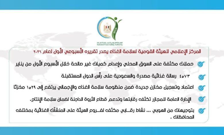 المركز الإعلامي للهيئة القومية لسلامة الغذاء يصدر تقريره الأسبوعي الأول لعام 2026