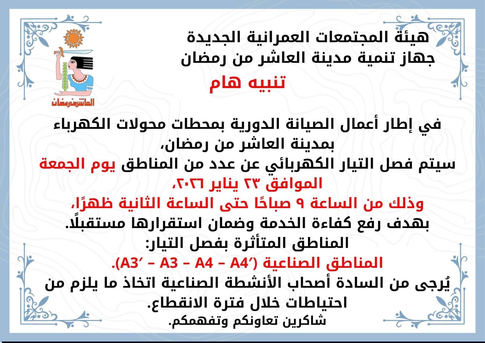 أعلنت رئاسة جهاز تنمية مدينة العاشر من رمضان أنه في إطار أعمال الصيانة الدورية بمحطات محولات الكهرباء بالمدينة، سيتم فصل التيار الكهربائي عن عدد من المناطق الصناعية، وذلك يوم الجمعة الموافق 23 يناير 2026، اعتبارًا من الساعة 9 صباحًا وحتى الساعة 2 ظهرًا.