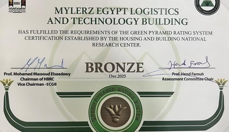 فى إطار توجه الدولة المصرية نحو تحقيق التنمية العمرانية المستدامة ، وتفعيل الاستراتيجية الوطنية للعمران والبناء الأخضر ، منح المركز القومي لبحوث الإسكان والبناء، التابع لوزارة الإسكان، شهادة الهرم الأخضر – المستوى البرونزي إلى شركة مايلرز للخدمات اللوجستية والتكنولوجية بأبوراش، كأحد المشروعات التي تطبق معايير واشتراطات الاستراتيجية الوطنية للعمران والبناء الأخضر في مصر.