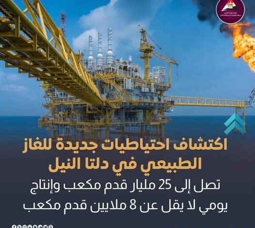 أعلنت “دانة غاز” الإماراتية عن اكتشاف جديد في بئر “شمال البسنت-1” في دلتا النيل البرية، لاحتياطيات غاز تُقدر بين 15 و25 مليار قدم مكعب، مع توقع بإنتاج يومي لا يقل عن 8 ملايين قدم مكعب.
