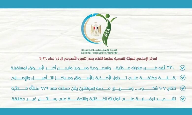 أصدر المركز الإعلامي للهيئة القومية لسلامة الغذاء تقريره الأسبوعي الـ 14 لعام 2026، وذلك عن الفترة من 11 – 17 إبريل 2026، والذي تضمن العديد من الأنشطة المختلفة على النحو التالي: