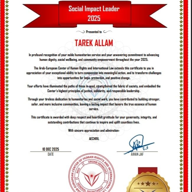 طارق علام يشكر المركز العربي الأوروبي لحقوق الإنسان على منحه شهادة قائد الأثر الاجتماعي لعام 2025
