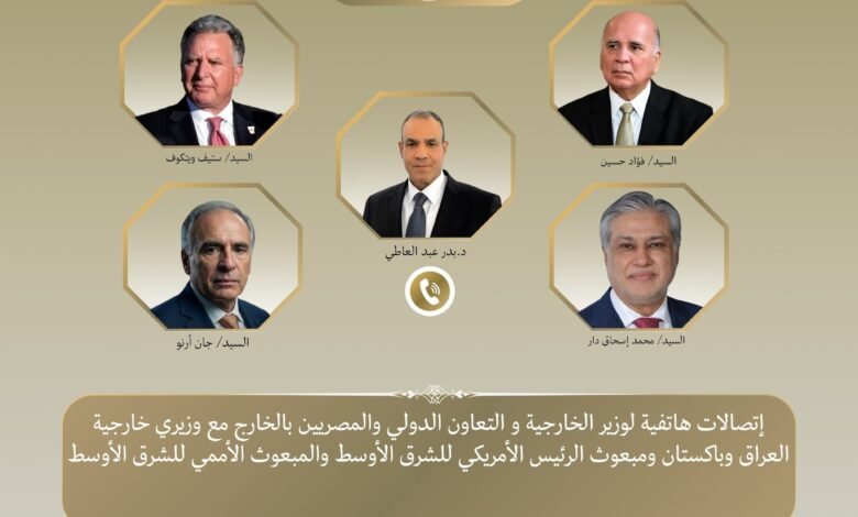 في إطار جهود خفض التصعيد واحتواء الموقف العسكري المتصاعد بالمنطقة، واصل د. بدر عبد العاطي وزير الخارجية والتعاون الدولي والمصريين بالخارج اتصالاته المكثفة حيث جرت اتصالات بين وزير الخارجية مع د. فؤاد حسين نائب رئيس مجلس الوزراء وزير خارجية جمهورية العراق، والسيد محمد إسحاق دار نائب رئيس الوزراء ووزير خارجية باكستان، والسيد ستيف ويتكوف المبعوث الأمريكي الخاص للشرق الأوسط، والسيد جان أرنو المبعوث الشخصي للسكرتير العام للأمم المتحدة للشرق الأوسط يوم الاثنين ٦ أبريل.