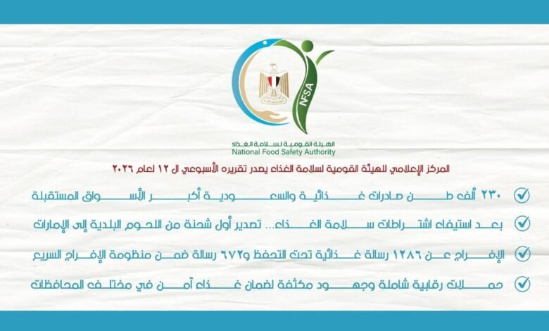 أصدر المركز الإعلامي للهيئة القومية لسلامة الغذاء تقريره الأسبوعي الـ 12 لعام 2026، وذلك عن الفترة من 28 مارس – 3 إبريل 2026، والذي تضمن العديد من الأنشطة المختلفة على النحو التالي: