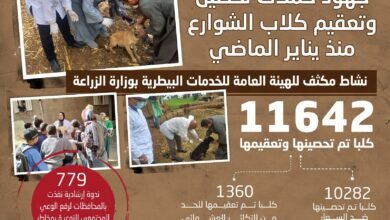 الزراعة تعلن تحصين وتعقيم أكثر من 11 ألف كلب حر منذ يناير وتنفيذ 779 ندوة إرشادية لرفع الوعي المجتمعي